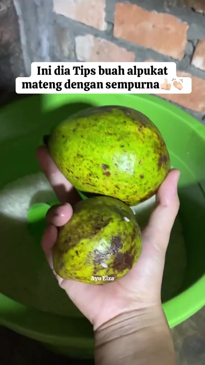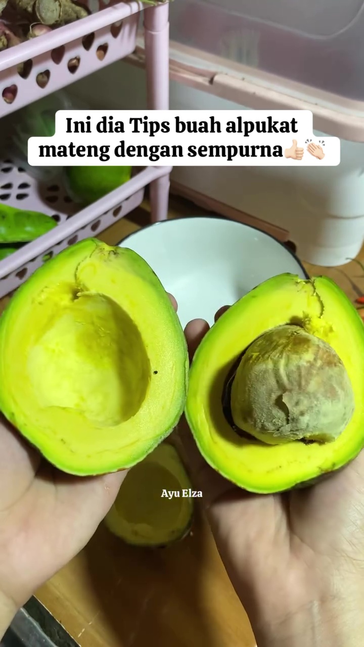 Setelah diperam, keluarkan alpukat dari wadah dan tekan perlahan permukaannya untuk memastikan tingkat kematangan. Jika terasa agak empuk namun tidak lembek, tandanya alpukat sudah siap disantap. Saat dibelah, daging buah akan tampak kuning kehijauan, lembut, tidak menghitam, dan rasanya manis alami tanpa ada bagian yang busuk.